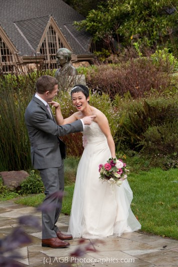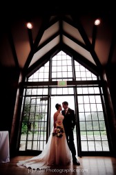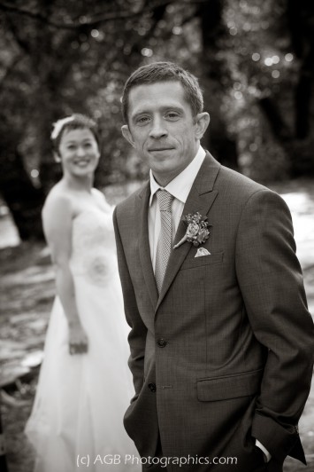 Halfway through the reception the skies cleared and the sun came out! Of course, I whisked the couple outside for some scenic portraits. I just love the reflections cast by the wet ground!