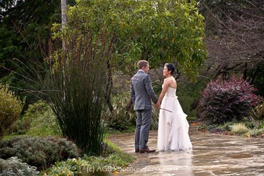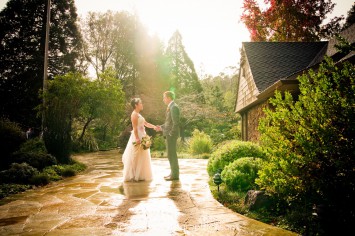 Halfway through the reception the skies cleared and the sun came out! Of course, I whisked the couple outside for some scenic portraits. I just love the reflections cast by the wet ground!